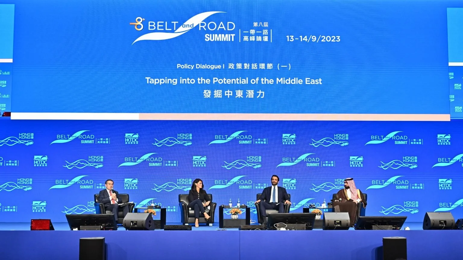 The Secretary for Financial Services and the Treasury, Mr Christopher Hui (first left), chaired the policy dialogue session titled “Tapping into the Potential of the Middle East” to explore effective ways to tap the Middle East markets, fostering complementarity, mutual benefits and collective development. The Advisor in the General Secretariat of the Council of Ministers, Saudi Arabia, Mr Fahd bin Abdulmohsan Al-Rasheed (first right); the Minister of Economy of the United Arab Emirates, Mr Abdulla Bin Touq Al Marri (second right); and the Minister, Ministry of International Cooperation, Egypt, Dr Rania A Al-Mashat (second left), joined the discussion.